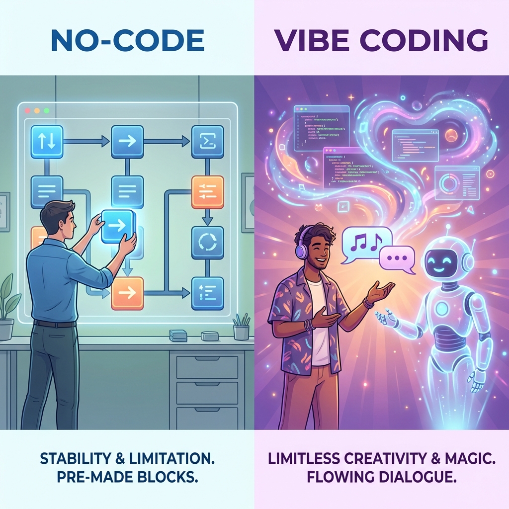 バイブコーディング(Vibe Coding)と、既存のノーコード・ローコード開発。どちらも「誰でも開発ができる」という文脈で語られがちですが、その「作り方」と「頭の使い道」に決定的な違いがあります。